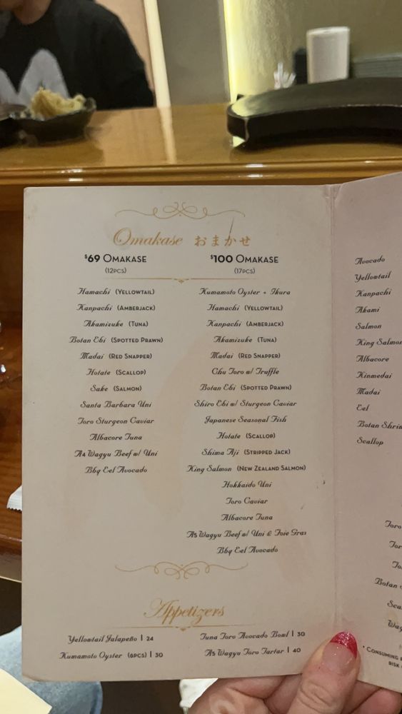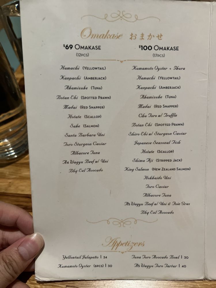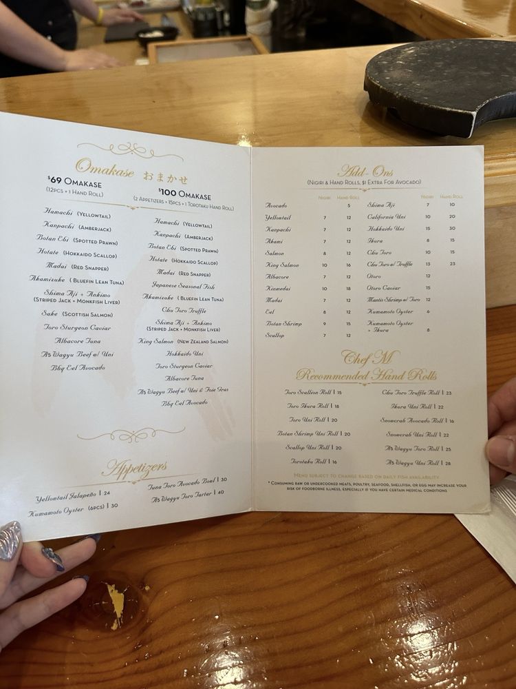seasonal nigiri pieces, plus one -piece cut roll. Avocado, Wagyu Toro roll and Toro Scallion Roll at extra cost.